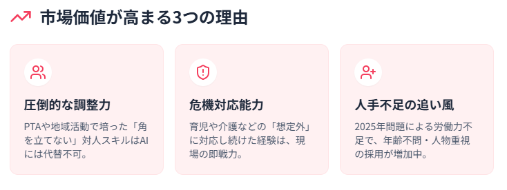 20年のブランクは、決して不利な要素だけではありません。人手不足が深刻化する2025年の転職市場において、専業主婦が培った「マルチタスク処理能力」「コミュニケーション能力(調整力)」「危機管理能力」は、若手にはない高度なビジネススキルとして再評価されています。