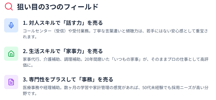この高度なソフトスキル(対人能力)こそ、AIには代替できない、企業が喉から手が出るほど欲しい能力なのです。若手社員が「ムリです」「パワハラです」と言って辞めてしまう場面でも、あなたは冷静に状況を分析し、落としどころを見つけられる。この「大人の対応力」は、20年間の人間関係の中で培われた、あなたにしかない財産です。