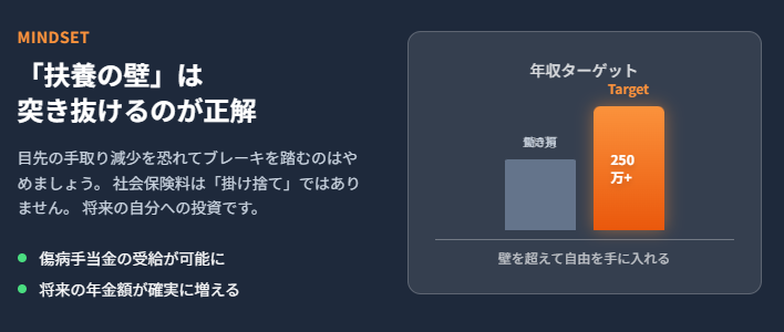 中途半端に130万〜150万円で働くと一時的に手取りが減りますが、年収250万円以上を目指せば手取りは確実に増えます。また、厚生年金に加入することで将来の年金が月額数万円単位で増え、傷病手当金などの保障も手厚くなります。目先の手取りより将来の保障を重視すべきです。