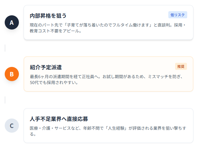 最初から正社員募集に応募するルートです。ただし、人気の事務職などは倍率が高いため、ターゲットを「人手不足で、年齢不問の業界」に絞ることが重要です。後述する医療・介護・サービス業などが該当します。