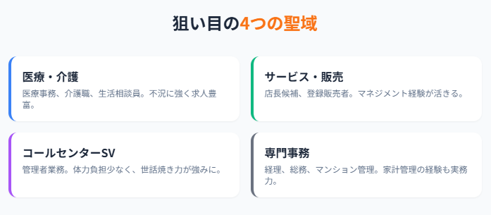 50代女性の採用に積極的な職種には、明確な傾向があります。若手が集まりにくく、かつ「人生経験」や「コミュニケーション能力」が重視される分野です。