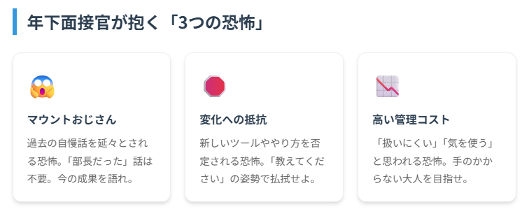 相手を攻略するには、まず相手の心理を知る必要があります。年下の面接官は、あなたに対して「敬意」よりも先に、強烈な「恐怖」を抱いています。この恐怖の正体を理解しない限り、どんなにスキルをアピールしても内定は遠のくばかりです。面接官が本当に知りたいのは、あなたの能力ではなく、組織に馴染めるかどうか。この本質を見抜くことが、面接突破の第一歩です。