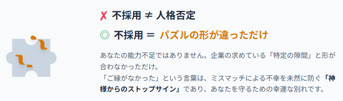 50代の採用は、ジグソーパズルのようなものです。企業は「ここの隙間(特定のスキルや役割)にピタリとハマるピース」を探しています。あなたが不採用になったのは、あなたの形がいびつだったからでも、色が汚かったからでもありません。単に「その隙間の形とは違った」だけなのです。