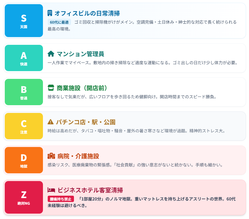 60代の方が、「未経験だけど掃除くらいなら」と軽い気持ちで応募し、配属された先が「病院の救急外来」や「繁忙期のビジネスホテル」だった場合、9割以上の人が1週間以内に「体が持たない」と言って辞めていきます。