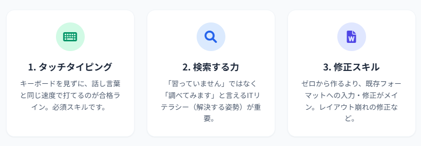 これができないと、話になりません。今の事務職は、チャットの返信やデータ入力において「スピード」が求められます。キーボードを指一本で探しながら打っているようでは、即戦力とはみなされません。
