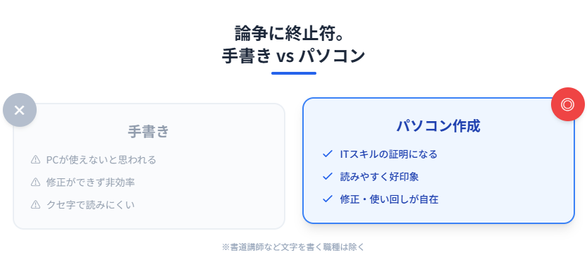 書道教室の講師、筆耕、手書きPOPライターなど、「字を書くこと」自体が業務内容である場合のみ、手書きが有利になります。それ以外(事務、警備、清掃、管理職など)は全てPC作成です。