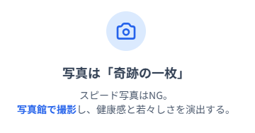 「人は見た目が9割」です。特にシニアの場合、写真から伝わる「健康感」「清潔感」「意欲」が合否を分けます。