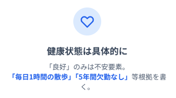 履歴書に「健康状態」の欄がある場合、「きわめて良好」と書くだけでは不十分です。企業は「今は元気でも、すぐ倒れるのでは?」と疑っています。