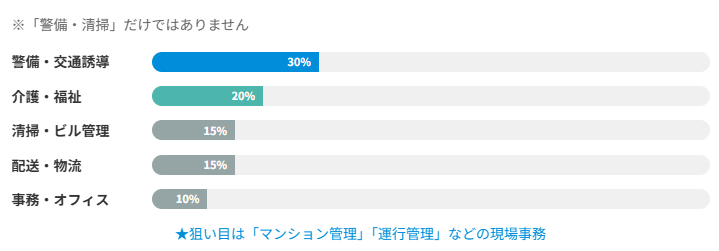 - 職種は「現場系」が多いが「事務・営業」もある