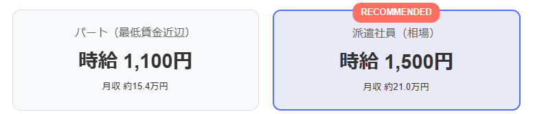 ハローワークのパート求人は、地域の最低賃金(1,050円〜1,150円程度)に張り付いています。一方、派遣の時給相場は1,300円〜1,700円です。