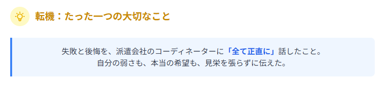 そんなある日、二社目の派遣会社のコーディネーターから電話がかかってきました。「高橋さん、その後いかがですか?」その優しい声に、高橋さんは堰を切ったように、これまでの失敗と後悔を全て正直に打ち明けました