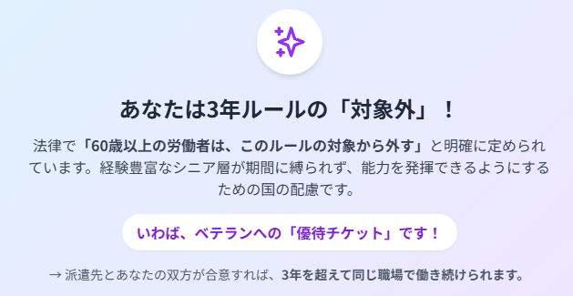 • 法律で「60歳以上の高年齢労働者」は3年ルールの対象外と明記されている