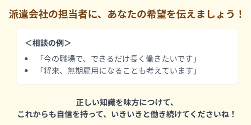 • 派遣会社の担当者に長期就業の希望を伝えることが最優先