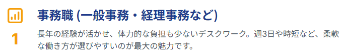 堂々の第1位は、やはり事務職。長年の社会人経験で培った電話応対や来客対応、基本的なPCスキルがそのまま活かせる、まさに60代女性の「王道」とも言えるお仕事です。