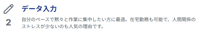 人気の理由は、在宅OKの求人もあること、体力的な負担はゼロで、人間関係のストレスも少ない点です。接客や電話応対が苦手な方でも、自分のペースでコツコツと仕事を進められるため、精神的な負担が少なく済みます。
