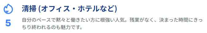 自分のペースで、黙々と働きたい方に根強い人気。特に早朝のオフィス清掃などは、午前中の早い時間に仕事が終わり、午後を丸々プライベートな時間として使えるのが大きなメリットです。