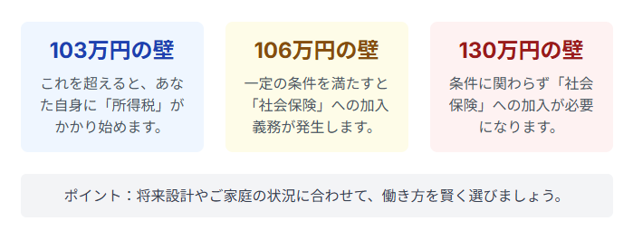 それは、ご家庭の状況や、将来設計によって変わってきます。一番シンプルなのは『103万円』を一つの目安にすること。でも、『将来の年金を少しでも増やしたい』と考えるなら、あえて『106万円』の壁を越えて社会保険に加入する、というのも賢い選択なんですよ。