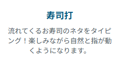 流れてくるお寿司のネタ(文章)を時間内にタイピングする、大人気のゲームです。「普通」「正確重視」「速度重視」などモードが選べ、楽しみながら自然と指が動くようになります