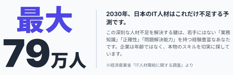 「若者ばかり」というIT業界のイメージは、もはや過去のものとなりつつあります。経済産業省の調査では、2030年に日本のIT人材は最大で約79万人も不足すると予測されており、企業は年齢不問で、本物のスキルを持つ人材を切実に探しているのです。