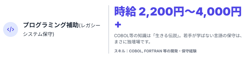 • レガシーシステム保守は希少価値で時給2,200円〜4,000円以上も可能