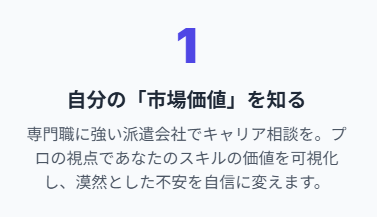 まずは、専門職に強い派遣会社に登録し、キャリアカウンセリングを受けてみましょう。プロの視点から、あなたの経歴の中で「今、企業が一番欲しがっているスキル」は何かを棚卸ししてくれます。