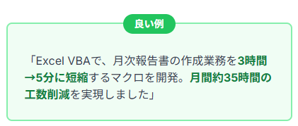 【良い例】「Excel VBAを用いて、従来3時間かかっていた月次報告書の作成業務を、ボタン一つで5分に短縮するマクロを開発。月間で約35時間の工数削減を実現し、残業時間の削減に貢献しました」