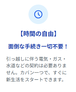 - 面倒な引っ越し手続きが不要で、カバン一つで新生活をスタートできます