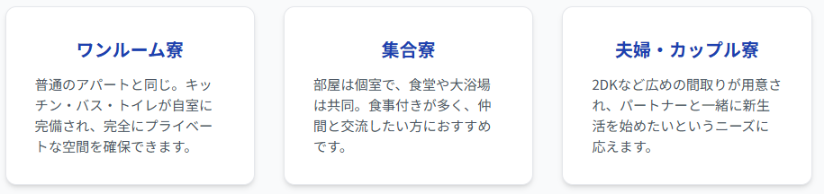 - 集合寮は食事付きが多く、栄養バランスの取れた食事と仲間との交流が楽しめます