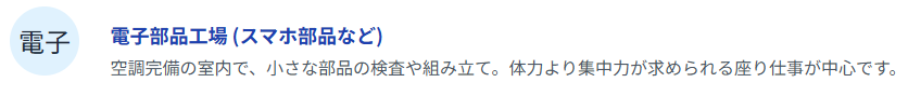 - 電子部品工場は空調完備のクリーンルームで、体力よりも集中力が求められます