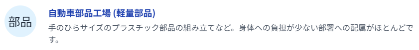 - 自動車部品工場でも、軽量部品を扱う部署ならシニア層に配慮されています