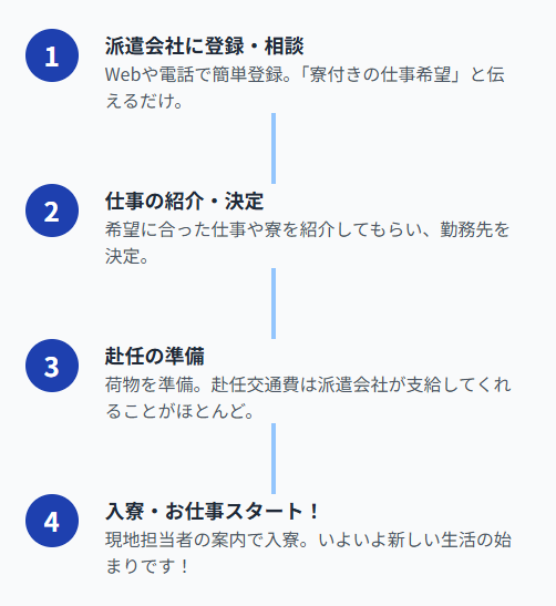 新しい人生を始めるのに、複雑な手続きは必要ありません。思い立ったが吉日。その一歩は、驚くほど簡単です。ここでは、実際に寮付き派遣で働き始めるまでの流れを、4つのステップで解説します。