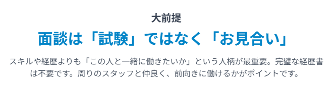 だからこそ、スキルや経験で自分を大きく見せる必要は一切ありません。それよりも、次の章で解説する「人柄」が、何よりも重要になるのです。面談では、あなたが職場の雰囲気に馴染み、チームの一員として協力できるかどうかが最も重視されています。