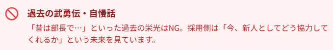 このNG例の問題点は、過去の実績ばかりが前面に出ており、「これから新しい環境でどう貢献するか」という視点が全く欠けていることです。採用担当者は「この人は過去の栄光にしがみついているのでは」と感じてしまいます。