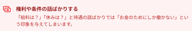 - 「給料は?」「休みは?」と権利や条件の話ばかりする