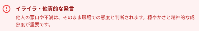 「(少し待たされた時に)まだですか?」「(前の派遣会社の担当者が)全然ダメでね…」イライラを態度に出したり、他責的な発言をしたりするのもNGです。
