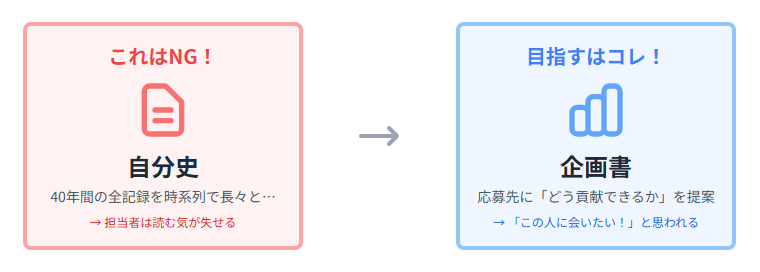 まず、マインドセットを切り替えましょう。あなたが書こうとしているのは「自分史」ではありません。応募する仕事の担当者に「私を雇うと、こんなに良いことがありますよ!」とプレゼンする「企画書」です。