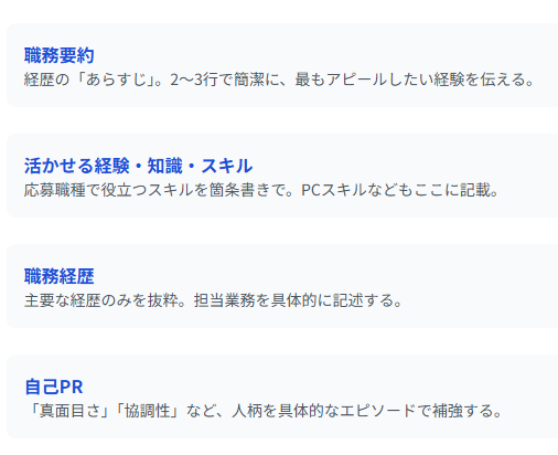 職務経歴書の基本構成:職務要約→活かせるスキル→職務経歴→自己PR