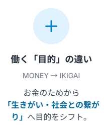 - 働く目的を「お金」から「生きがい・社会貢献」へ切り替えることが重要
