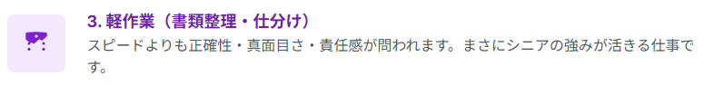 これも座り仕事が中心です。スピードよりも、「正確性」と「真面目さ」「責任感」が問われる仕事です。これは、まさにシニアの皆さんが、長年の経験で培ってきた強みそのものです。
