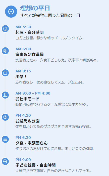 これは、すべてが完璧に回った、まさに奇跡の一日です。こんな日は、月に1~2回あるかないか。しかし、この理想のスケジュールを知っておくことで、「目指すべき姿」が明確になり、日々の改善点も見えてきます。