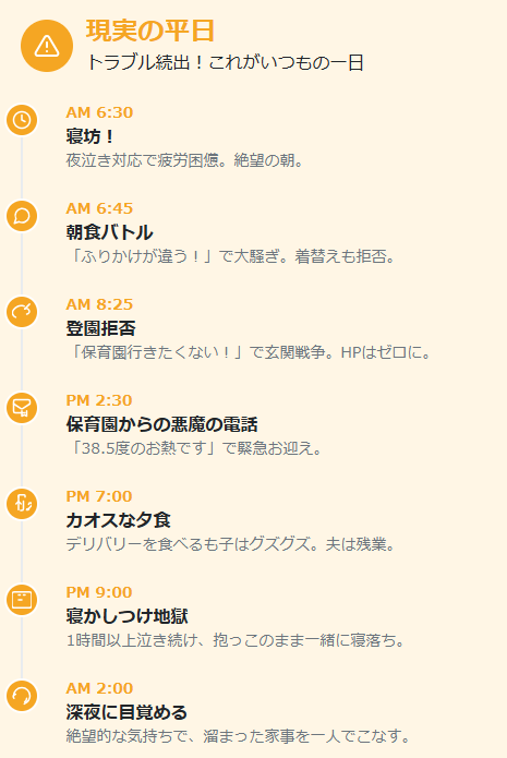 多くのワーママの日常は、実はこちらの「現実編」に近いかもしれません。予期せぬトラブル、子どものグズグズ、そして自分の体力の限界。理想通りにいかない日の方が圧倒的に多いのです。でも、それが普通。完璧な日など、滅多にありません。