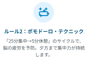 このリズムを作ることで、夕方になっても集中力が持続し、「脳が疲れ果てて、何も考えられない…」という状態を防ぐことができます。最初は25分が長く感じるかもしれませんが、慣れてくると驚くほど作業がはかどるようになります。