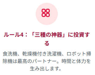 - 三種の神器(食洗機・乾燥機付き洗濯機・ロボット掃除機)への投資を惜しまない