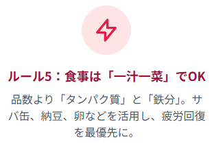 - 平日の食事は一汁一菜と割り切り、タンパク質と鉄分を重視する