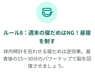 - 週末の寝だめはNG、15〜30分の昼寝で疲労回復