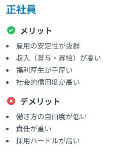 - 正社員:勤務先企業と直接・無期限の雇用契約を結ぶ最も安定した働き方