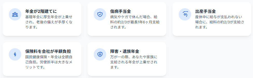 厚生年金で将来の年金が増え、傷病手当金や出産手当金など手厚い保障が受けられます。