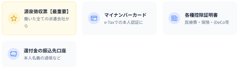 掛け持ちをした方は特に注意が必要です。2社で働いたなら2枚、3社なら3枚、すべての派遣会社から源泉徴収票を受け取る必要があります。1枚でも欠けていると正確な申告ができないため、手元にすべて揃っているか必ず確認してください。