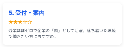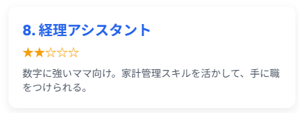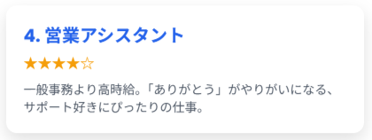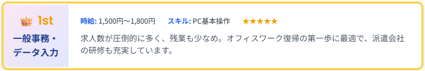 - 1位は王道の「一般事務」:PCの基本操作ができればOK。求人数が圧倒的に多く、オフィスワーク復帰の第一歩に最適