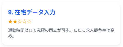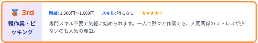 - 黙々作業が得意なら「軽作業」:スキル不要で気軽に始められる。人間関係のストレスが少ない